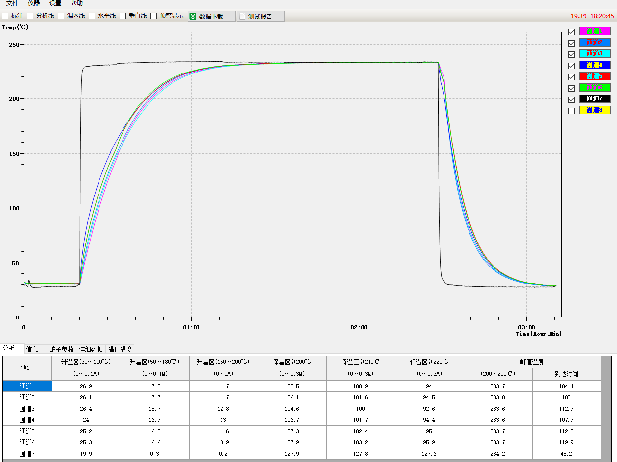 9、軟件具有智能預警功能,測試出來曲線瞬間判斷出來爐溫是否合格。  |
